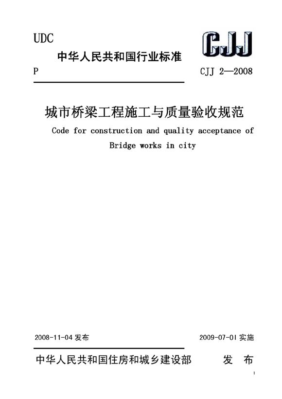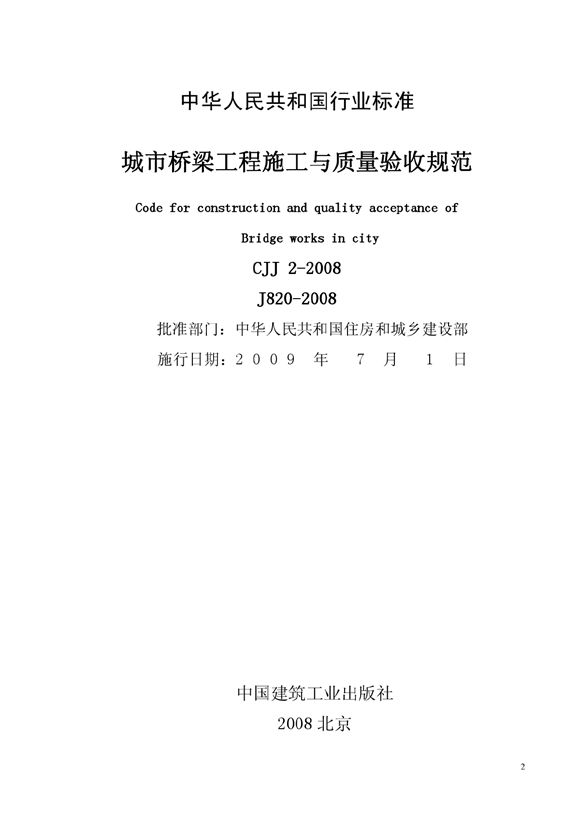 《城市桥梁工程施工与质量验收规范》(CJJ2-2008),内容详细丰富,可供网友参考下载。