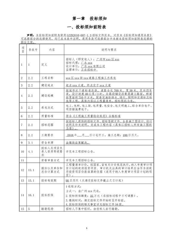 本投标须知前附表使用GZZB2010-007-1.3招标文件范本,对范本《投标须知通用条款》可选择部分的选择使用,均已在本表中注明,通用条款可选择部分中未被本投标须知前附表选择的部分无效。