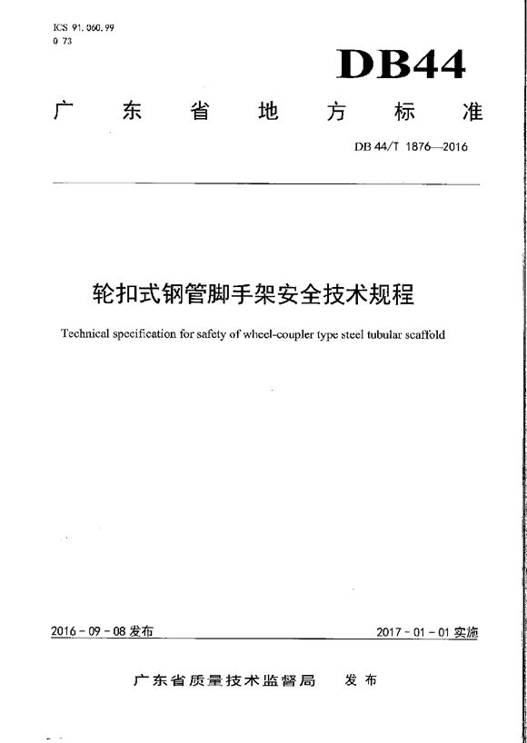 轮扣式钢管脚手架安全技术规程DB44/T1876-2016,广东省标准,2017年1月1日实施