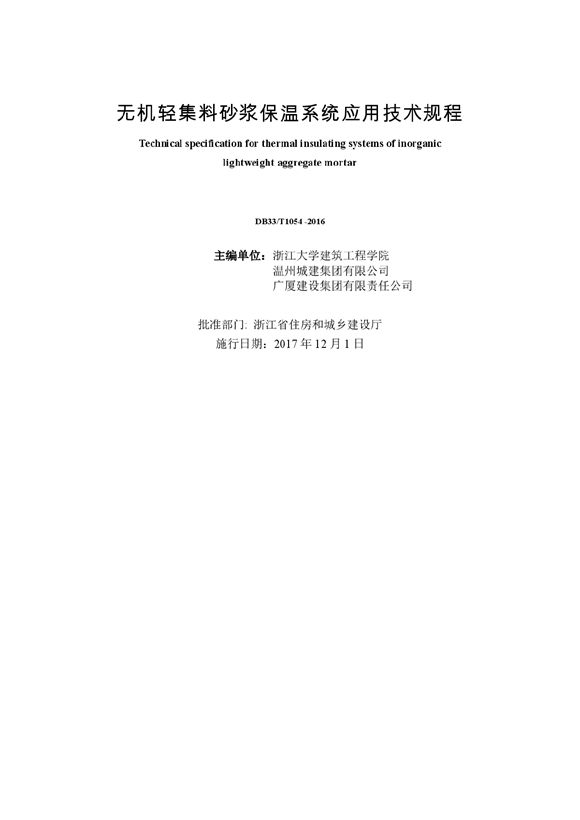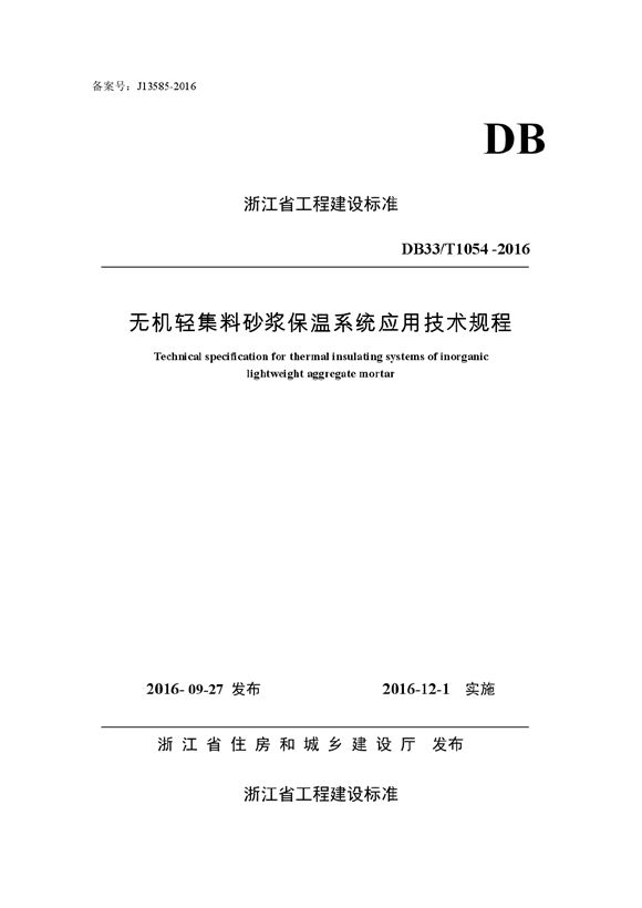 DB33-T1054-2016-浙江省无机轻集料砂浆保温系统应用技术规程