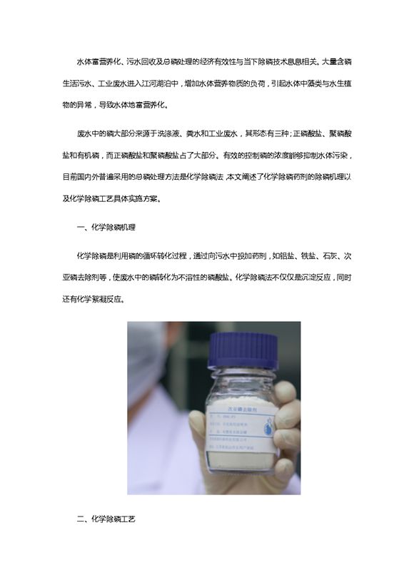 废水中的磷大部分来源于洗涤液、粪水和工业废水,其形态有三种;正磷酸盐、聚磷酸盐和有机磷,而正磷酸盐和聚磷酸盐占了大部分。有效的控制磷的浓度能够抑制水体污染,目前国内外普遍采用的总磷处理方法是化学除磷法