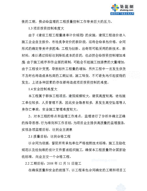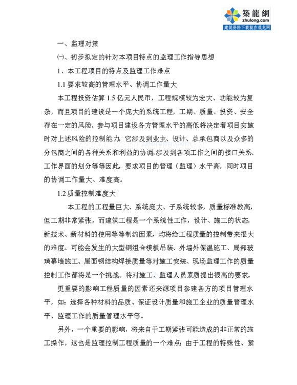 内容简介一、监理对策㈠、初步拟定的针对本项目特点的监理工作指导思想1、本工程项目的特点及监理工作难点1.1要求较高的管理水平、协调工作量大本工程工程规模较为宏大、功能较为复杂,而且项目的建设