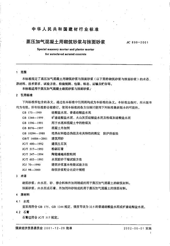 JC 890-2001 蒸压加气混凝土用砌筑砂浆与抹面砂浆