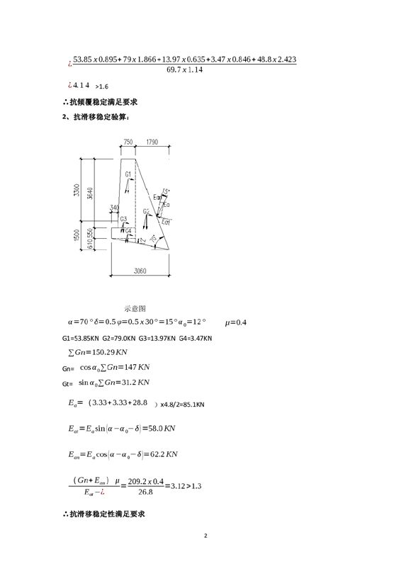 1、抗倾覆验算:2、抗滑移稳定验算:3、地基承载力验算:4、墙身强度验算: