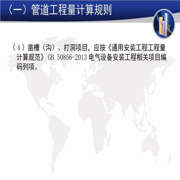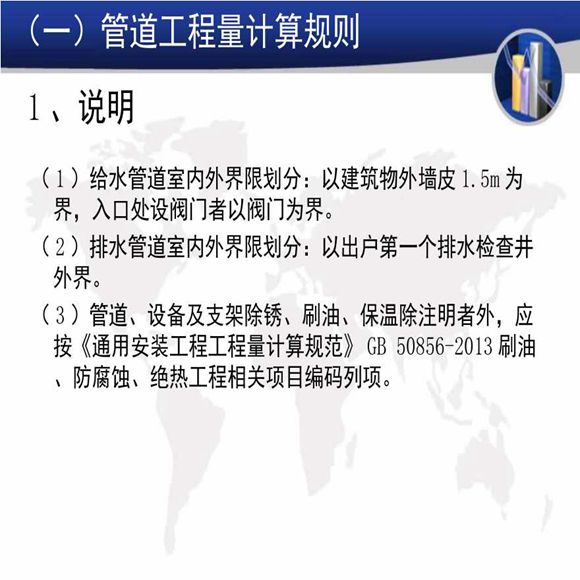 【简介】给排水工程量计ppt格式【目录】管道工程量计算规则工程计算示例(1)给水管道室内外界限划分:以建筑物外墙皮1.5m为界,入口处设阀门者以阀门为界。(2)排水管道室内外界限划分:以出