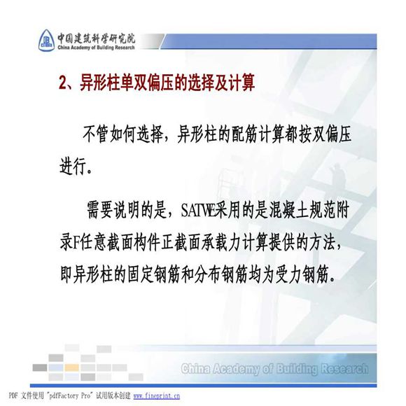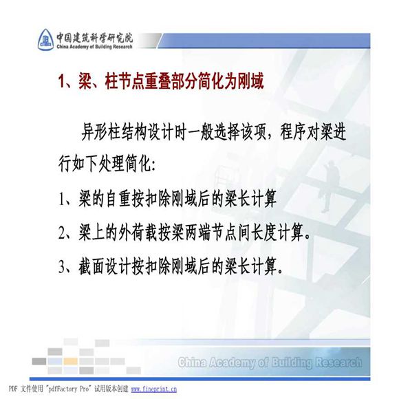 本资料为PKPM计算异形柱结构计算异形柱结构注意的问题,ppt格式,共14页。主要内容:1、梁、柱节点重叠部分简化为刚域、梁、柱节点重叠部分简化为刚域2、异形柱单双偏压的选择及计算、异形柱