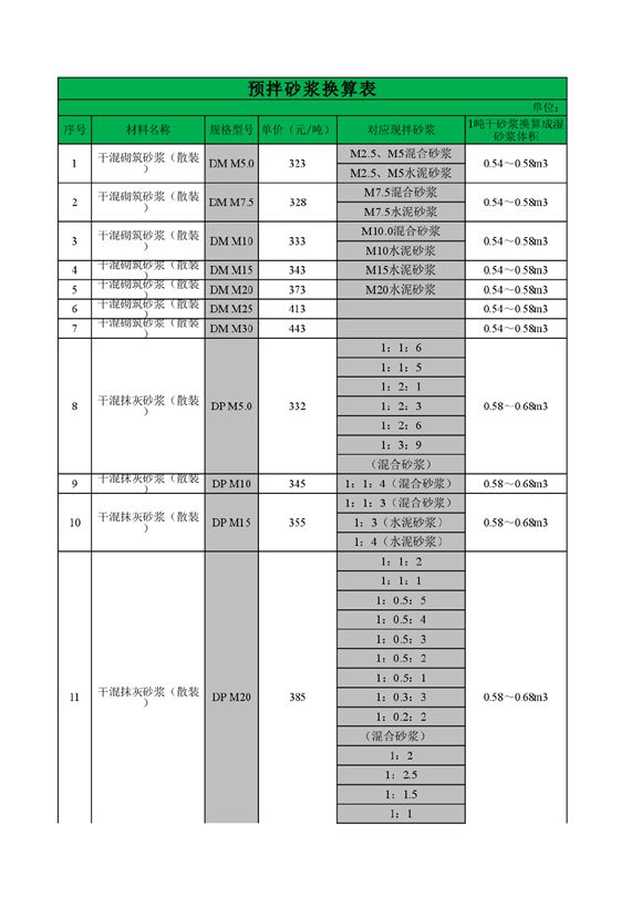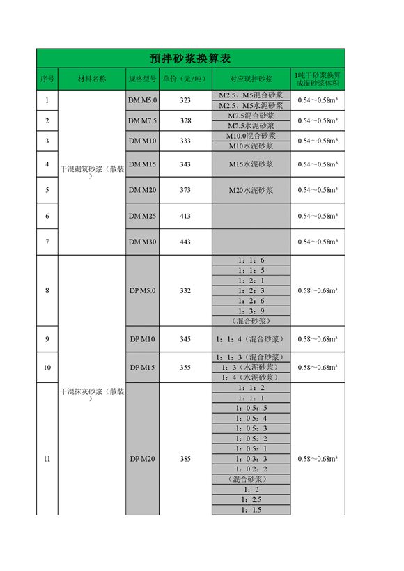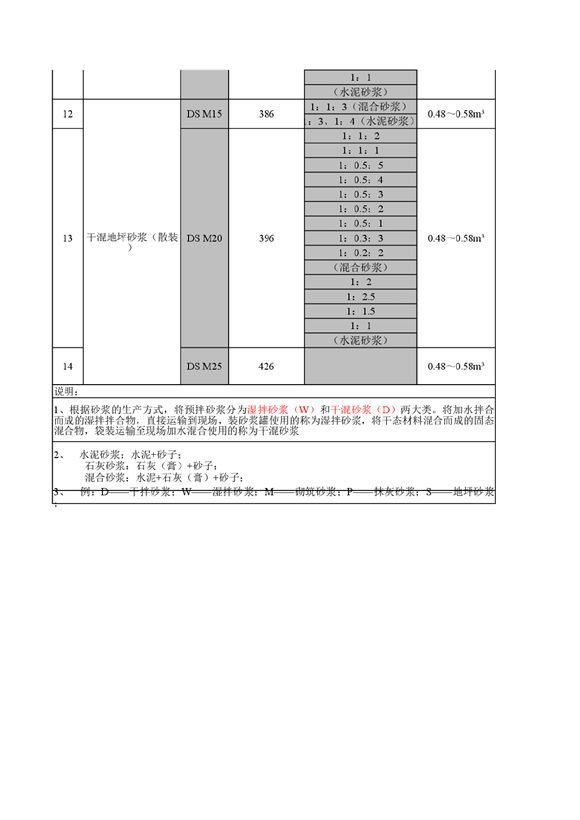 包含:干混砌筑砂浆(DM),干混抹灰砂浆(DP),干混地坪砂浆(DS),对应现拌砂浆配合比详细表格!