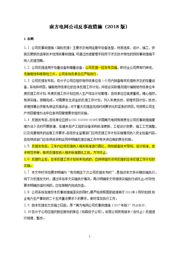 2018版南方电网反事故措施南方电网公司反事故措施(2018版)1总则1.1公司反事故措施(简称反措)主要涉及电网运营中设备选型、材质选择、设计、施工、安装及更新改造等技术性预防事故措施,可通过