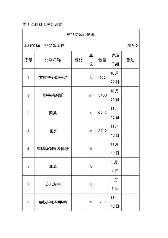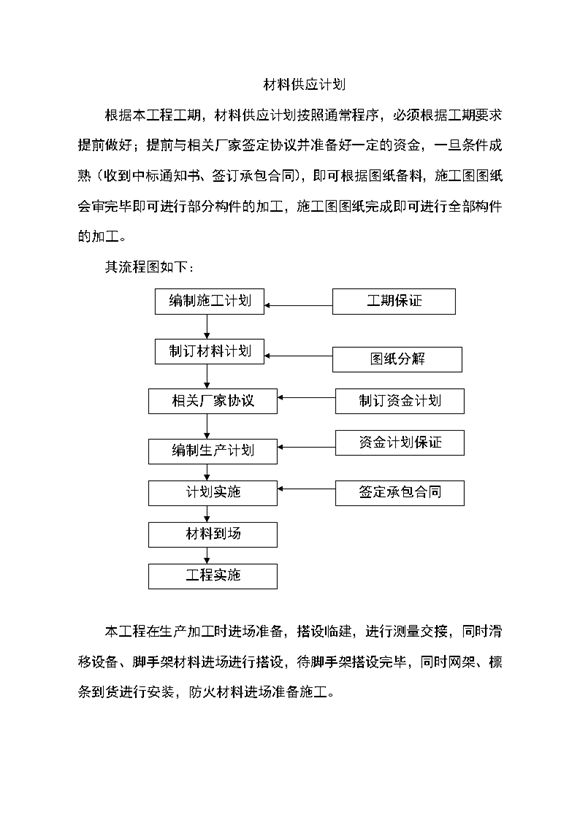 根据本工程工期,材料供应计划按照通常程序,必须根据工期要求提前做好;提前与相关厂家签定协议并准备好一定的资金,一旦条件成熟(收到中标通知书、签订承包合同),即可根据图纸备料,施工图图纸会审完毕即可进行