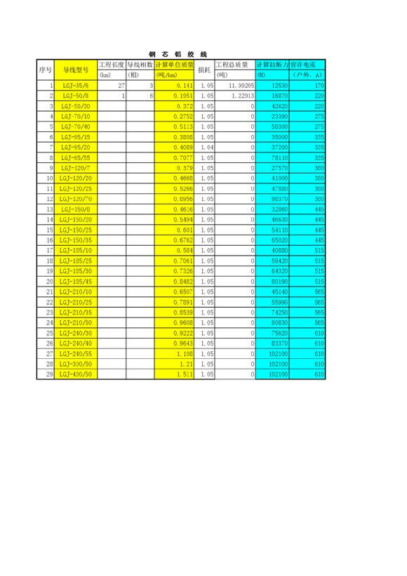 大家一定在计算钢芯铝绞线重量时一定很繁琐,每次还要翻阅电力金具手册,现在就不用了,我这里自己做了一个钢芯铝绞线的计算表格,只要把相应的导线公里长度和导线根数输入,就可以自动在后面计算出来。希望大家喜欢