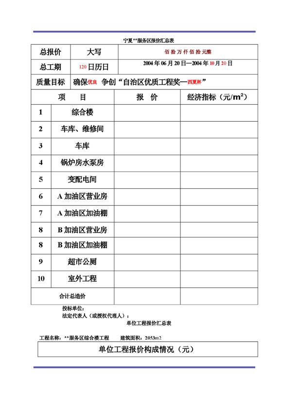 总报价大写佰拾万仟佰拾元整总工期120日历日2004年06月20日—2004年10月20日质量目标确保优良争创“自治区优质工程奖—西夏杯”