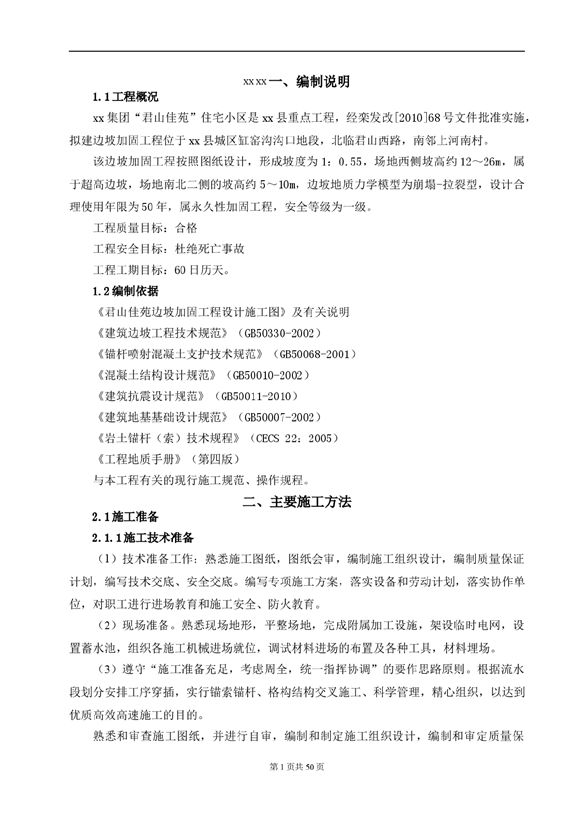 拟建边坡加固工程位于xx县城区缸窑沟沟口地段,北临君山西路,南邻上河南村。该边坡加固工程按照图纸设计,形成坡度为1:0.55,场地西侧坡高约12~26m,属于超高边坡,场地南北二侧的坡高约5~10m