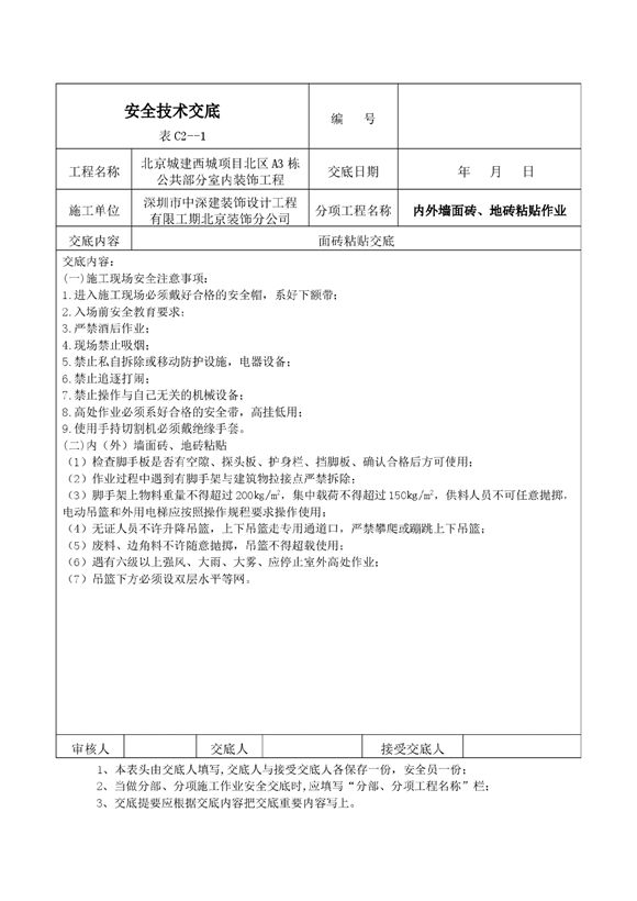 装饰装修安全技术交底范文,面砖粘贴交底,轻钢骨架及饰板吊顶,临时用电作业交底