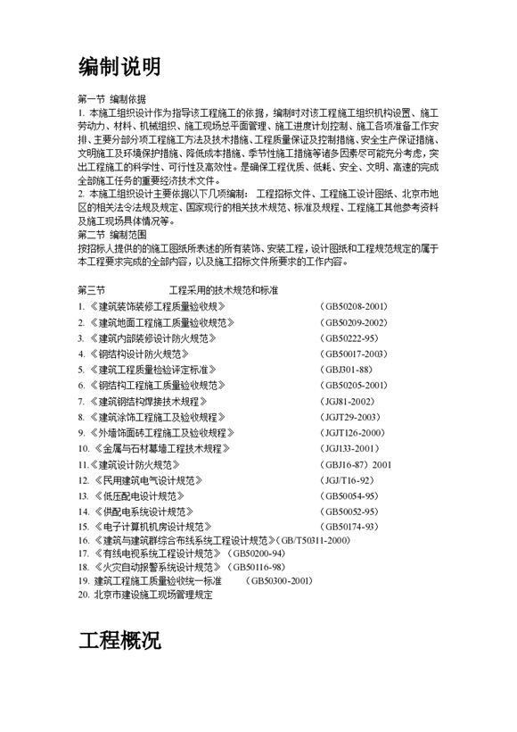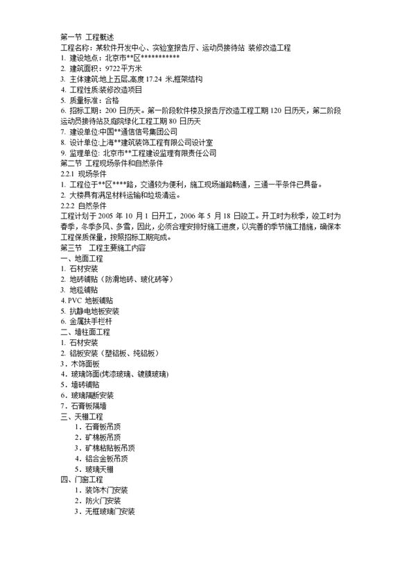 第一节工程概述工程名称:某软件开发中心、实验室报告厅、运动员接待站装修改造工程1.建设地点:北京市2.建筑面积:9722平方米3.主体建筑:地上五层,高度17.24米,框架结构4