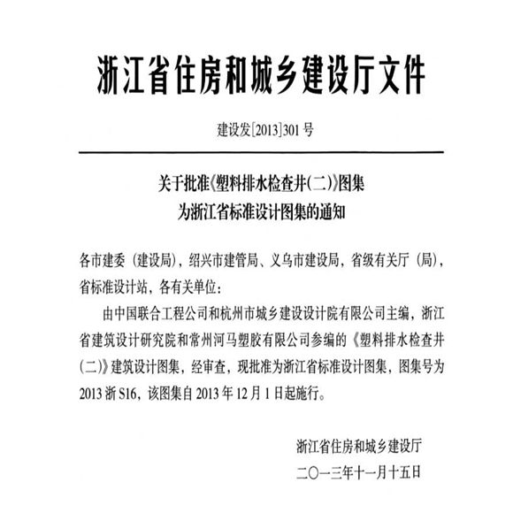 浙江省给排水施工图集,由中国联合工程公司和杭州市城乡建设设计院有限公司主编,浙江省建筑设计研究院和常州河马塑胶有限公司参编的《塑料排水检查井(二)》建筑设计图集,经审查,现批准为浙江省标准设计图