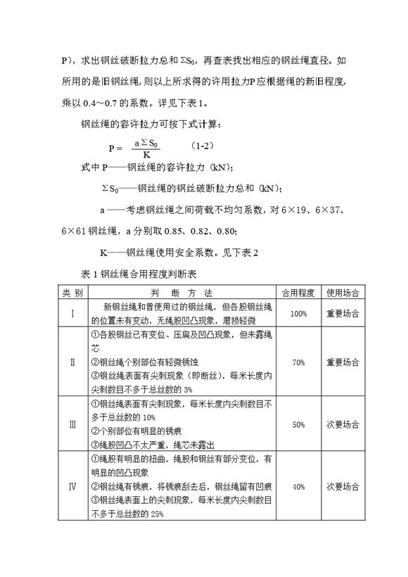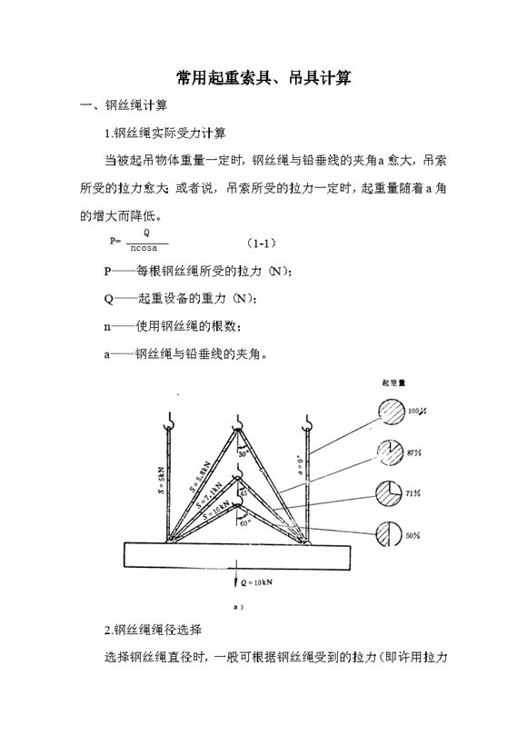 一、钢丝绳计算1.钢丝绳实际受力计算当被起吊物体重量一定时,钢丝绳与铅垂线的夹角a愈大,吊索所受的拉力愈大;或者说,吊索所受的拉力一定时,起重量随着a角的增大而降低。(1-1)P——每根钢丝绳