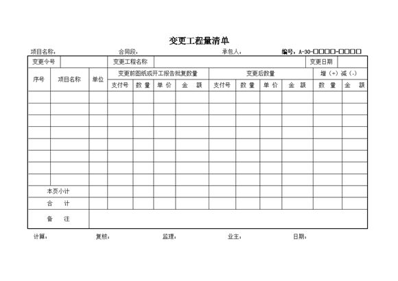 变更工程量清单表格格式模板