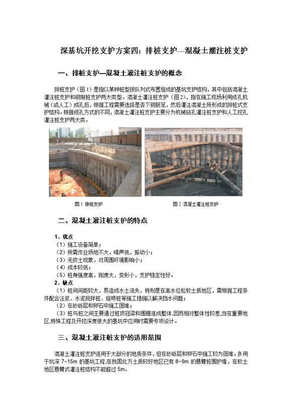 排桩支护(图1)是指以某种桩型按队列式布置组成的基坑支护结构,其中包括混凝土灌注桩支护和钢制桩支护两大类型。混凝土灌注桩支护(图2),指在施工现场利用成孔机械(或人工)成孔后,根据工程需要选择是否下钢