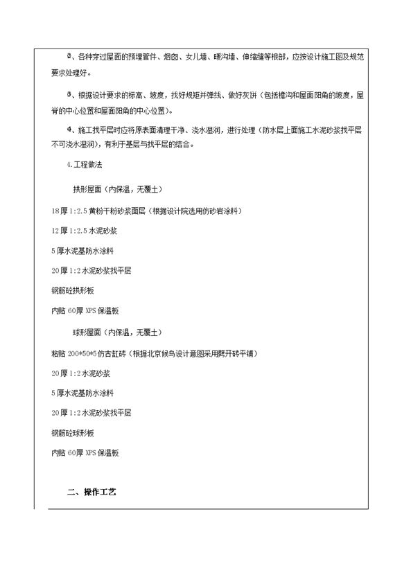 工艺流程:基层清理→管根封堵→标高坡度弹线、找出天沟和屋面阳角的坡度、屋脊的中心位置和屋面阳角的中心位置、做灰饼→冲筋→洒水湿润→施工1:2水泥砂找平层→养护→验收。基层清理:
