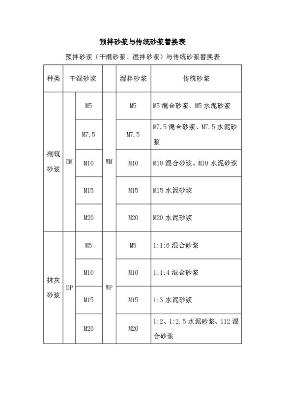 预拌砂浆(干混砂浆、湿拌砂浆)与传统砂浆替换表,预拌砂浆(干混砂浆、湿拌砂浆)与传统砂浆替换表。