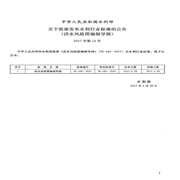 水利部关于批准发布水利行业标准的公告(洪水风险图编制导则)(2017年第12号)中华人民共和国水利部批准《洪水风险图编制导则》(SL483-2017)为水利行业标准,现予以公布。序号标准名