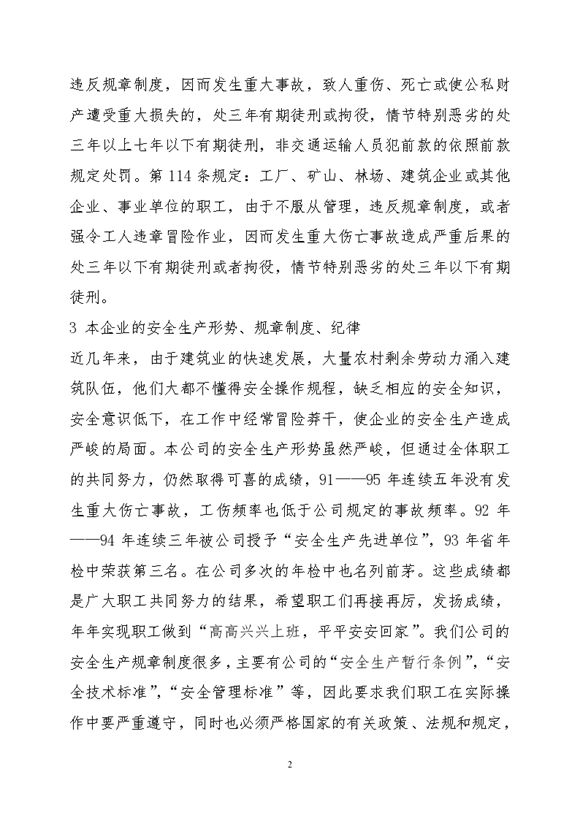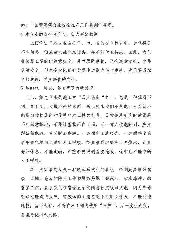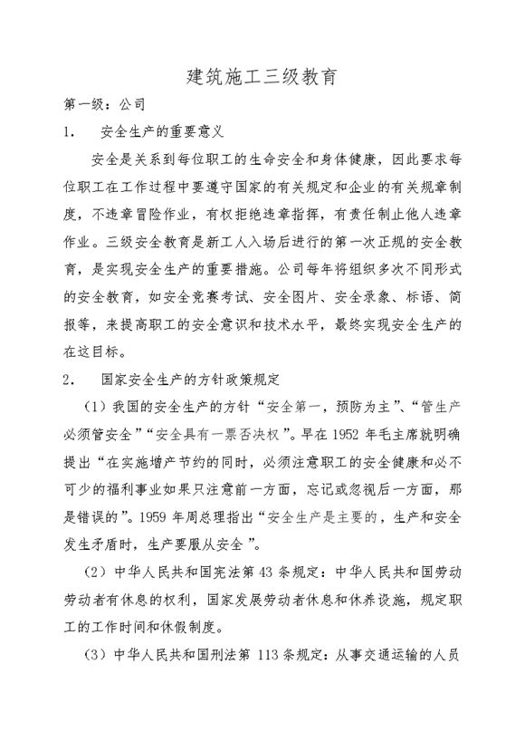 本文档为三级安全教育内容(工地工人入场安全教育),包括:内容简介:安全是关系到每位职工的生命安全和身体健康,因此要求每位职工在工作过程中要遵守国家的有关规定和企业的有关规章制度,不违章冒险作业,有权