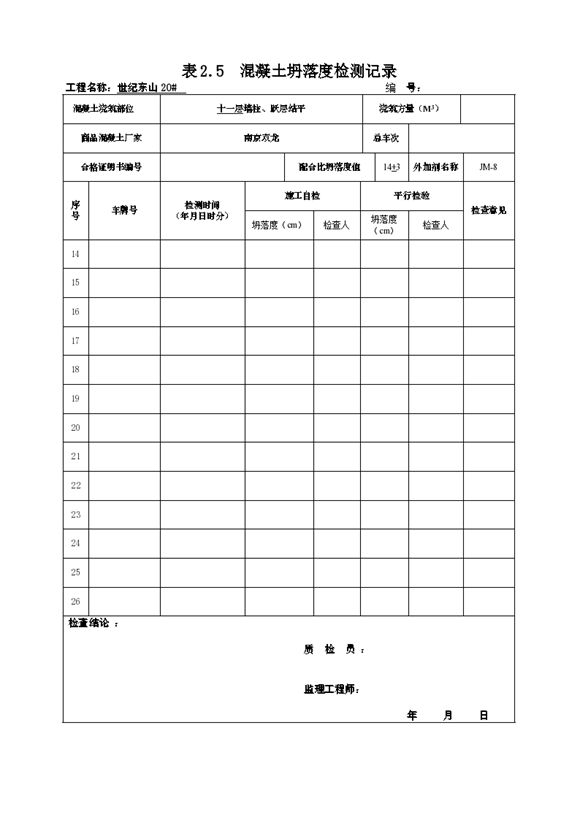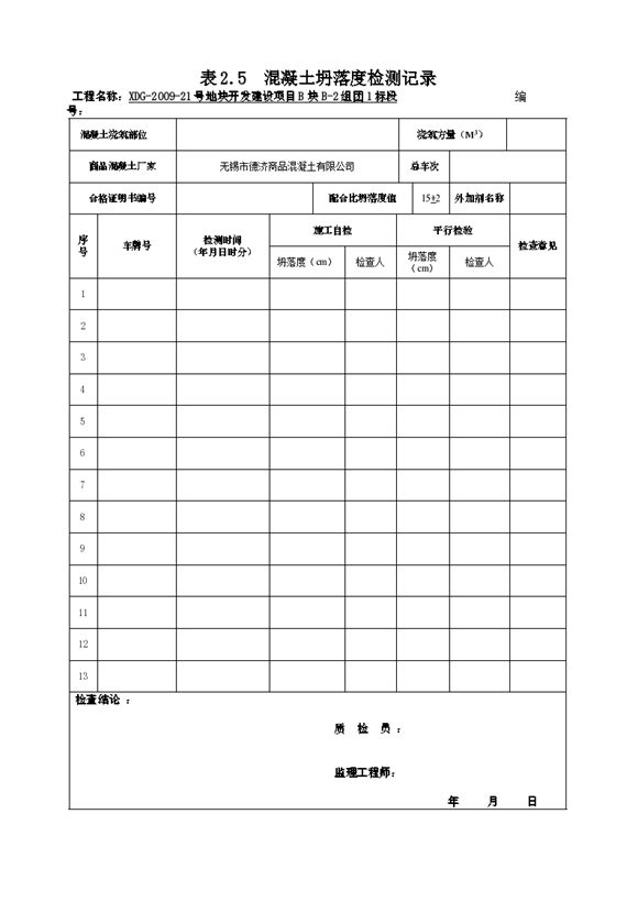 本文档为混凝土坍落度检测记录表模板(参考),包括:内容简介:检验方法:用坍落度检测器和钢尺量测检查。检验数量:施工单位应对每车预拌混凝土坍落度进行检查,监理单位至少每十车进行一次平行检验。施工单位自