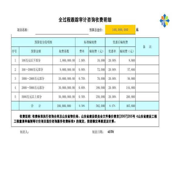 全过程跟踪审计咨询费计算表,只要输入工程总造价,就可计算出咨询费,比较实用。