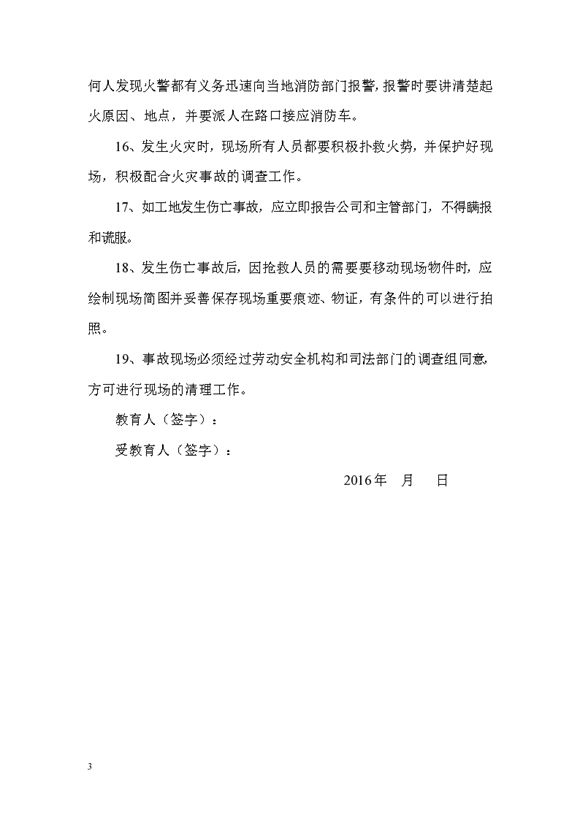 本文件为施工单位三级安全教育内容详细内容;内容包括工人进场公司一级安全教育内、工人进场项目部二级安全教育内容、工人进场班组三级安全教育内容、模板班组安全生产教育内容、混凝土班组安全生产教育内容、农民工