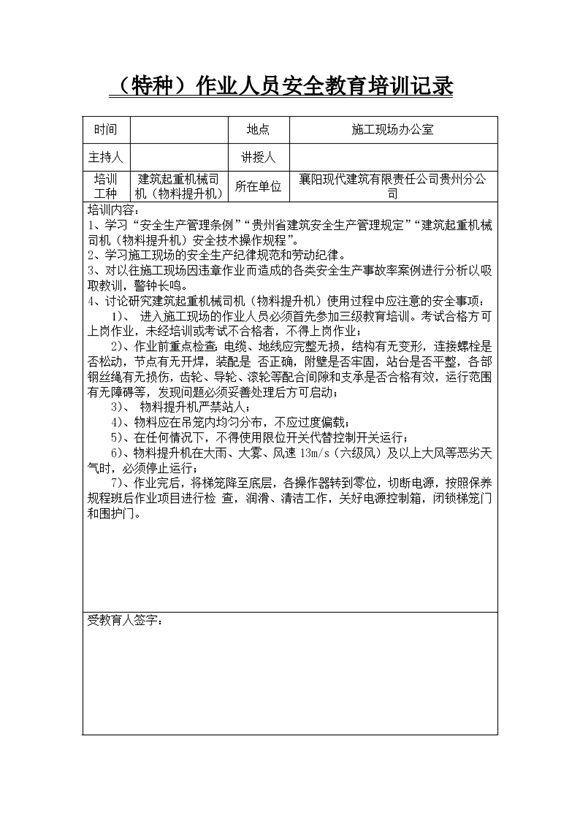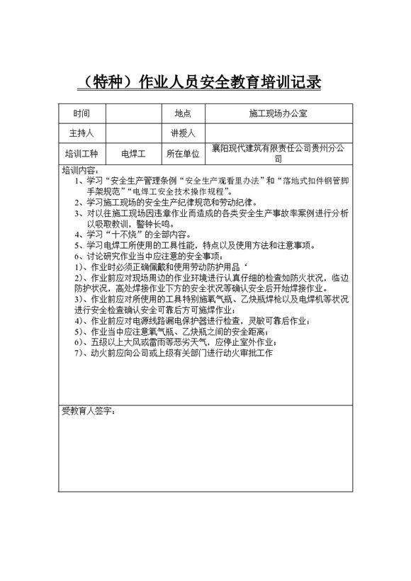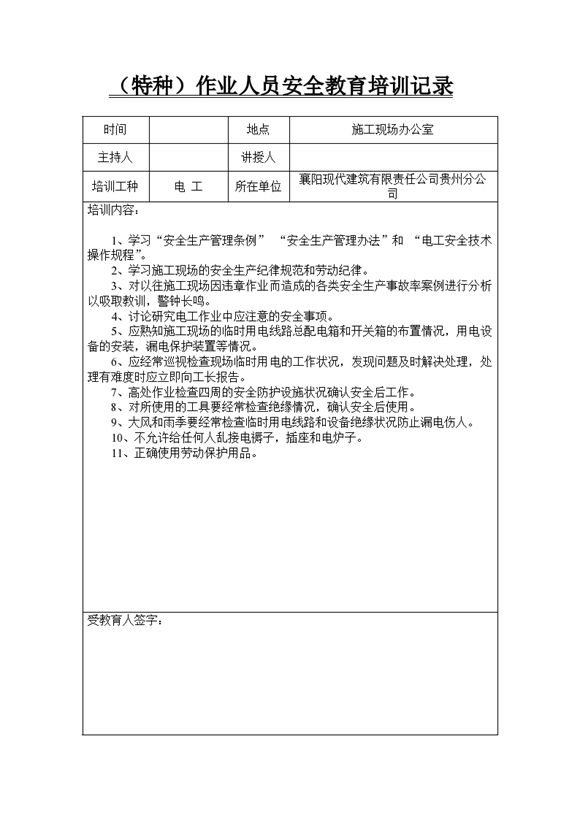 本文档为特种作业人员安全教育培训记录(包含各个工种),包括:资料概况:培训内容:1、学习“安全生产管理条例”“安全生产管理办法”和“电工安全技术操作规程”。2、学习施工现场的安全生产纪律规范