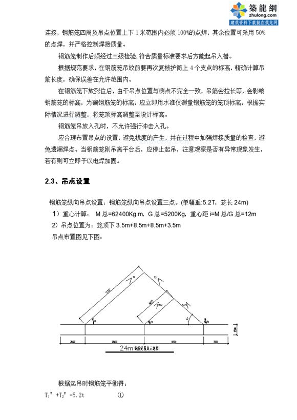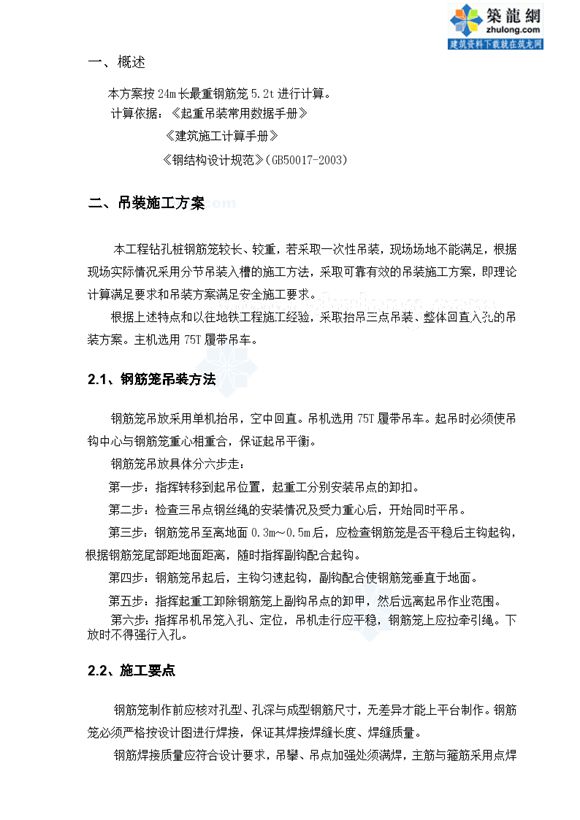 本工程钻孔桩钢筋笼较长、较重,若采取一次性吊装,现场场地不能满足,根据现场实际情况采用分节吊装入槽的施工方法,采取可靠有效的吊装施工方案,即理论计算满足要求和吊装方案满足安全施工要求。根据上述特点和