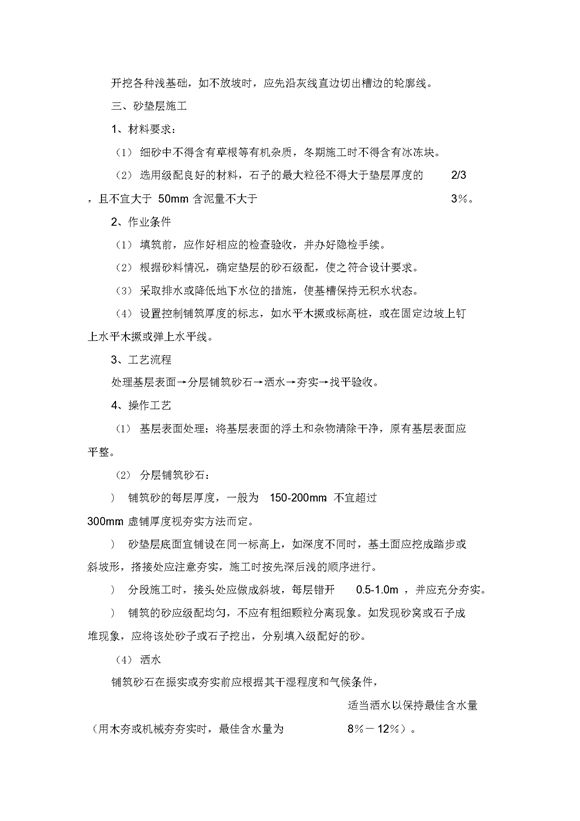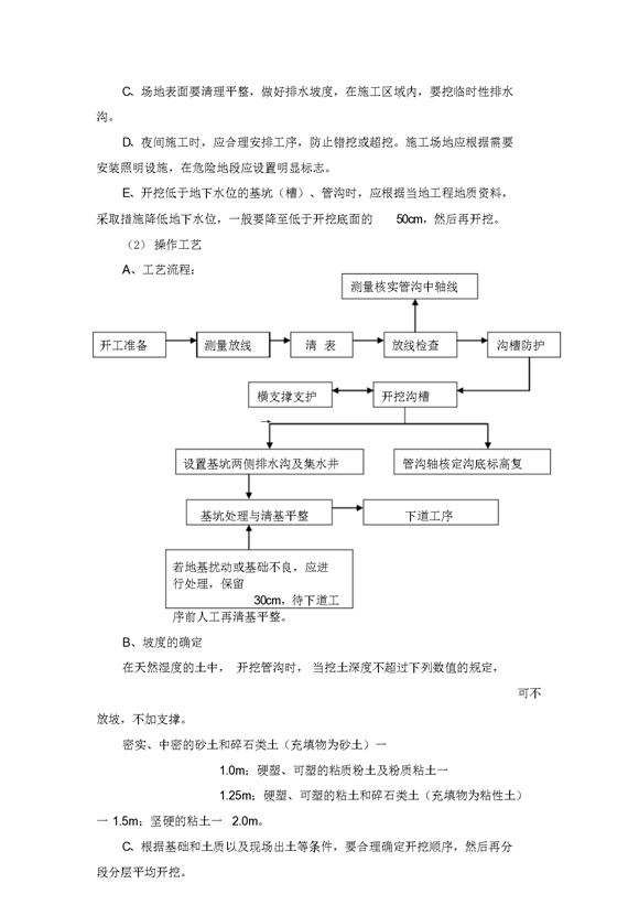 1、沟槽开挖(1)作业条件:A、土方开挖前,应摸清地下管线等障碍物,并应根据施工方案的要求,将施工区域内的地上、地下障碍物清除和处理完毕。B、建筑物或构筑物的位置或场地的定位控制线(桩),标准