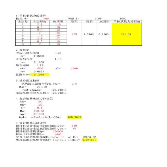 水泥土搅拌桩复合地基承载力计算,和大家一起学习参考。类似的地基处理桩都可以采用