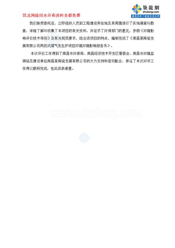 内容简介建设项目名称:南昌某陶瓷发展有限公司两段式煤气发生炉项目建设项目性质:改造。根据产业政策,单段式煤气发生炉属于限制类,将被淘汰,因此,吉尼斯陶瓷发展有限公司将现租用的单段式煤气发生炉系统改