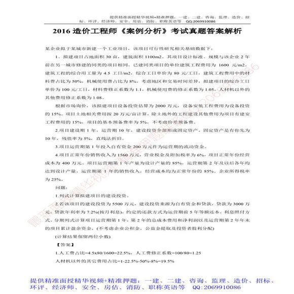2016造价工程师案例分析考试真题及答案解析