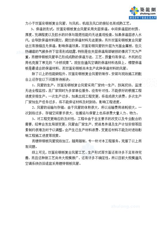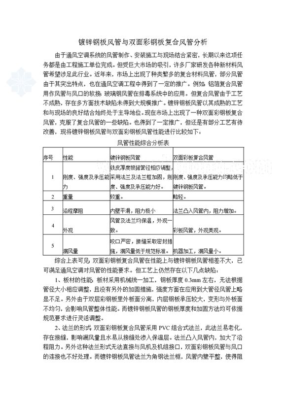 本资料为镀锌钢板风管与双面彩钢板复合风管分析,现在市场上出现了一种双面彩钢板复合风管,克服了复合风管的一些缺陷。也得到了一定推广,但还是有部分工艺有待改善,现将镀锌钢板风管与双面彩钢板风管性能进行比较