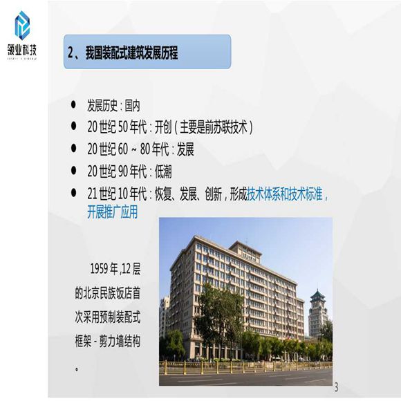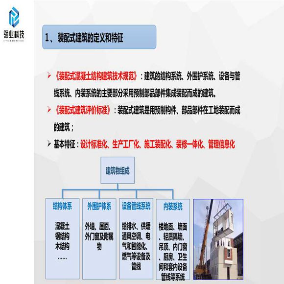 装配式混凝土结构建筑技术规范》:建筑的结构系统、外围护系统、设备与管线系统、内装系统的主要部分采用预制部品部件集成装配而成的建筑。《装配式建筑评价标准》:装配式建筑是用预制构件、部品部件在工地装配而