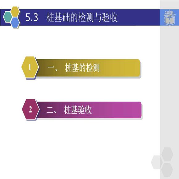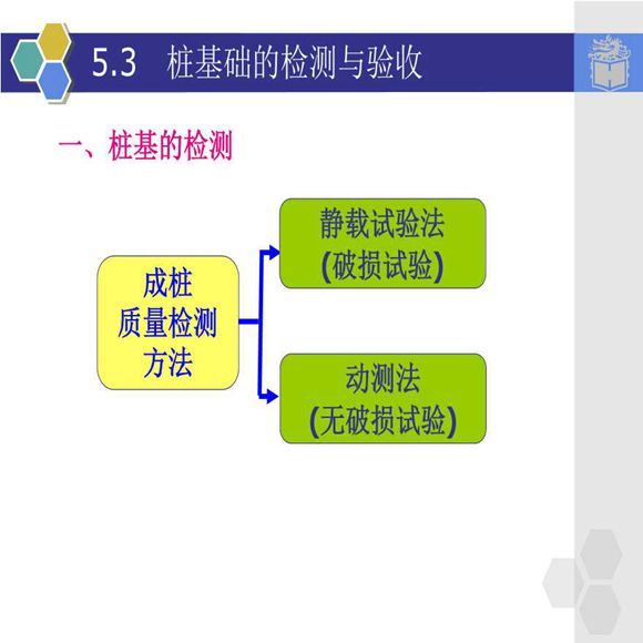 1.静载试验法(1)试验目的采用接近于桩的实际工作条件,通过静载加压,确定单桩的极限承载力,作为设计依据,或对工程桩的承载力进行抽样检验和评价。静载试验对于地基基础设计等级为甲级或地质