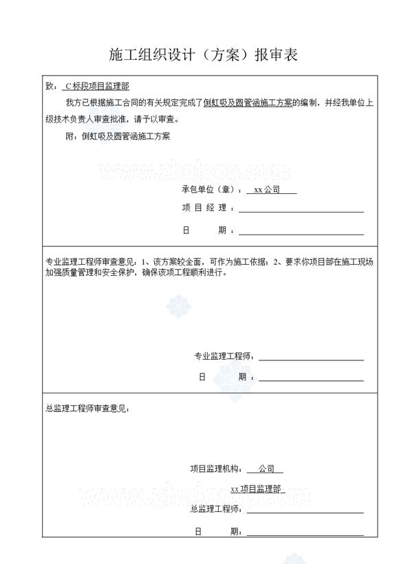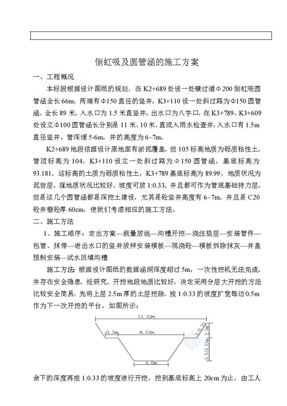 本标段根据设计图纸的规划,在K2+689处设一处横过道Φ200倒虹吸圆管涵全长66m,两端有Φ150直径的竖井。K3+110设一处斜过路为Φ150圆管涵,全长89米,入水口为1.5米直竖井,出水口为八