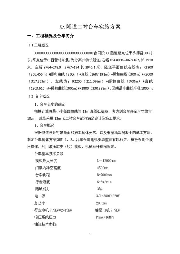 1、台车长度的确定根据计算得最小半径圆曲线与12m直线弧弦距,考虑到台车净空尺寸放大10cm,现场采用12m长二衬台车能够满足设计及施工要求。2、台车概况根据隧道设计衬砌断面和施工具体要求,以及