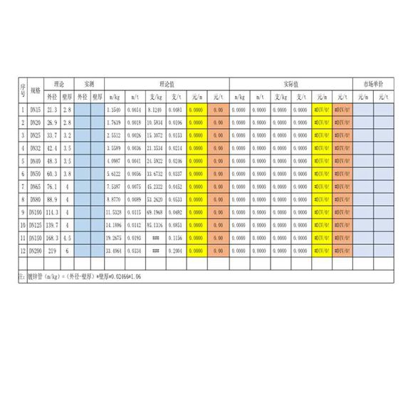 镀锌钢管重量单价自动换算表
