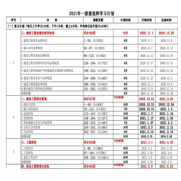 2021年一级建造师学习计划,以机电工程为主,涵盖每章节具体到每天。