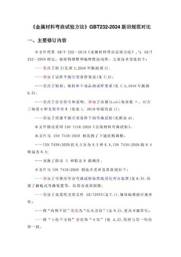 《金属材料弯曲试验方法》GBT232-2024新旧规范对比