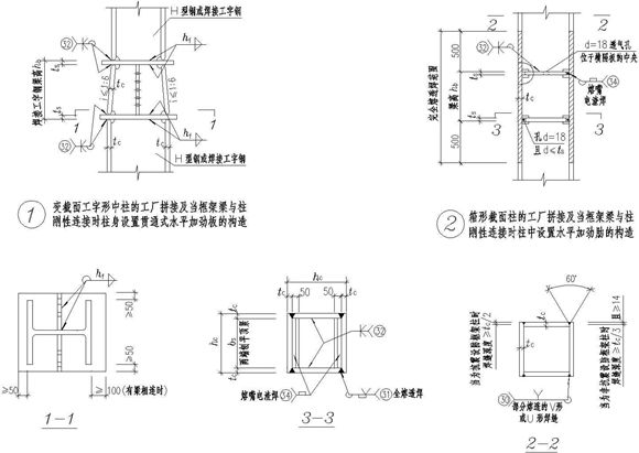 本图纸为10套常见钢结构节点设计详图(共10张标准详细)。内容包括:消能梁段与柱连接时的构造要求、箱形截面柱与十字形截面柱、十字形截面柱的刚性连接、内藏钢支撑剪力墙的混凝土墙板构造等图纸,