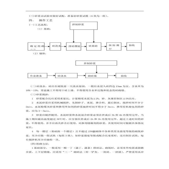 (一)砖:1品种、强度等级必须符合设计要求,且砖的强度等级地下为M15地上为M10,并有出厂合格证、产品性能检测报告。清水墙的砖应色泽均匀,边角整齐。基础砂浆强度地下为M10水泥沙浆,主体为