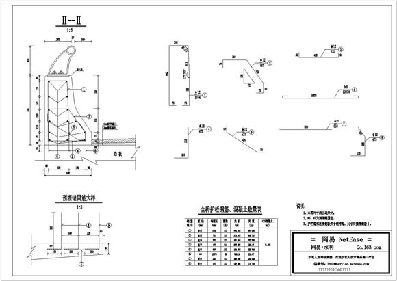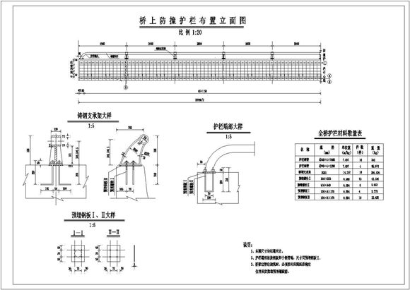 本图纸共两张,为公路方庄护拦结构钢筋图。图纸包含:桥上防撞护栏布置立面图、铸钢支承架大样、护栏端部大样、全桥护栏材料数量表、预埋钢板Ⅰ、Ⅱ大样、预埋锚固筋大样、钢筋详图等。