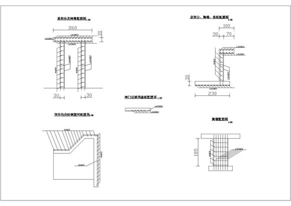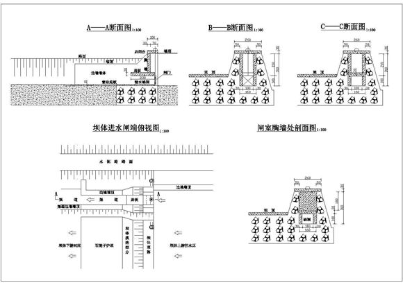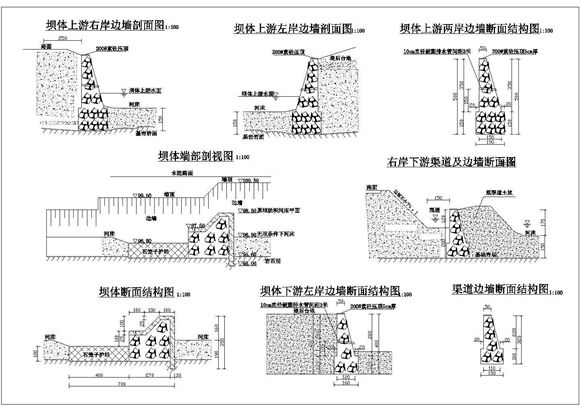 该小型拦河坝设计坝体及挡墙均为浆砌石结构,图纸包含坝体及个挡墙剖面图、进水闸结构图、启闭机及闸墩配筋图。