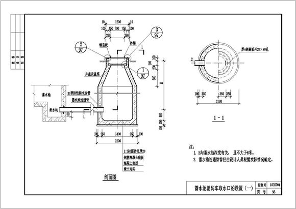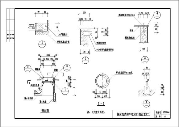 常用的节点大样-消防水池取水口施工图,图集号L03S004,第96页及97页内容,蓄水池消防车取水口的设置(一)及蓄水池消防车取水口的设置(二)。包含取水口剖面图及节点大样。