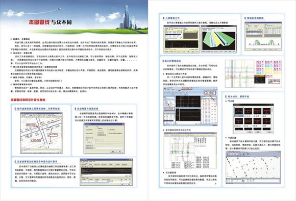 不同专业部门协同设计,自动或交互绘制给水、雨水、污水,平面数据与纵断数据统一呈现协同关联,满足各种竖向设计要求。三维管道土方,可视化的管线综合竖向设计及自动碰撞检查,平差计算。软件直接以施工图习惯绘图