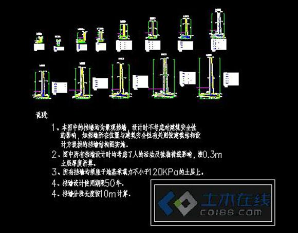 悬臂式挡土墙大样/施工图。本图中的挡土墙均为景观挡墙,设计时不考虑对建筑安全性的影响,如挡土墙所在位置与建筑安全性有关则按建筑结构设计方土工的挡墙结构图实施。图中所有挡土墙设计时均考虑了人的活动及植物